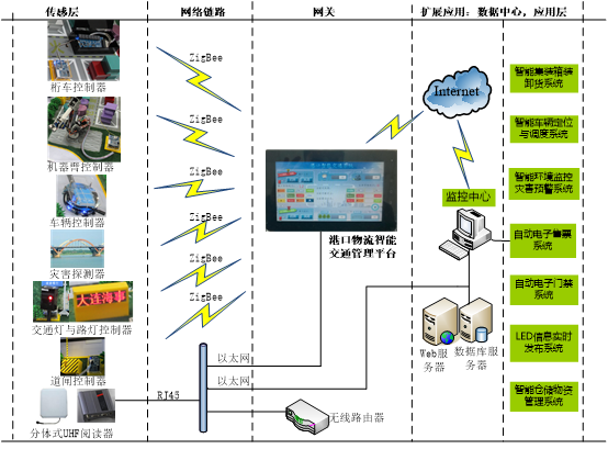 倉儲物流交通實訓(xùn)系統(tǒng)覆蓋物聯(lián)網(wǎng)的傳感層、網(wǎng)絡(luò)鏈路層、網(wǎng)關(guān)、以及應(yīng)用層。智能網(wǎng)關(guān)是整個系統(tǒng)的核心,是連接傳感層與應(yīng)用層的橋梁。系統(tǒng)拓?fù)淙鐖D所示。