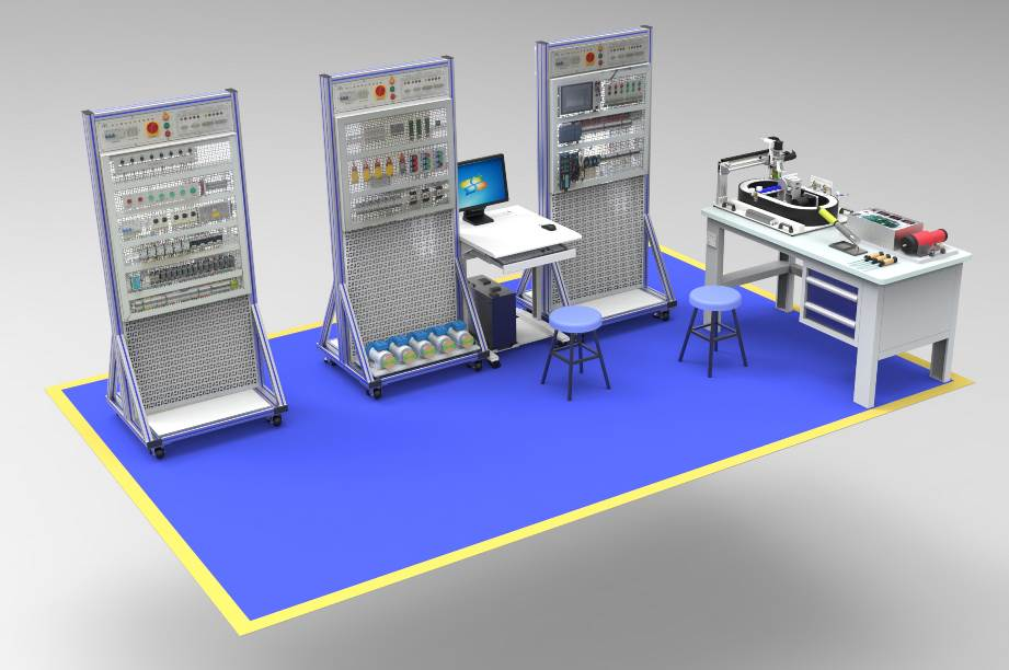 該設(shè)備由PLC電氣控制應(yīng)用平臺(tái)、電力拖動(dòng)安裝平臺(tái)、立式塑膠機(jī)控制電路故障診斷實(shí)訓(xùn)平臺(tái)、電腦桌、裝配桌、實(shí)訓(xùn)儀表工具等組成。