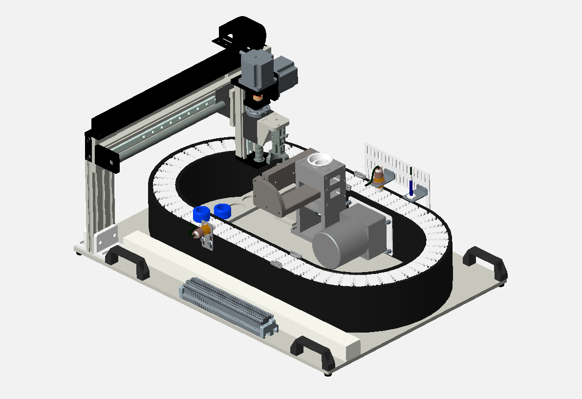 模型底板由8mm厚鋁板加工氧化而成,裝有四個(gè)黑色鑄鋁拉手,方便搬運(yùn)。底板上方有環(huán)形輸送帶、氣動(dòng)機(jī)械手、搬運(yùn)龍門架、分揀機(jī)構(gòu)、變頻電機(jī)、伺服電機(jī)、步進(jìn)電機(jī)、多種傳感器及氣缸等組成。該任務(wù)模擬生產(chǎn)線自動(dòng)化控制,變頻器控制輸送帶電機(jī)實(shí)現(xiàn)調(diào)速功能;通過(guò)光纖、光電、金屬、RFID等多種傳感器檢測(cè),PLC控制伺服、步進(jìn)、多種氣缸動(dòng)作完成上料、分揀、搬運(yùn)等多種功能。同時(shí)為方便教學(xué),端口采用全開放設(shè)計(jì)。
