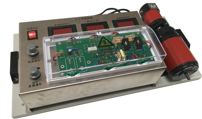 模塊底板采用優(yōu)質(zhì)Q235冷軋鋼板經(jīng)折彎后焊接而成,表面靜電噴塑處理。底板上裝有兩個(gè)黑色鑄鋁拉手,方便搬運(yùn)。底板上方有直流電機(jī)、測(cè)速發(fā)電機(jī)、直流調(diào)速線路板、顯示系統(tǒng)等組成。該模塊采用測(cè)速發(fā)電機(jī)反饋電壓和給定電壓形成閉環(huán)調(diào)速系統(tǒng),調(diào)速系統(tǒng)由給定電壓、轉(zhuǎn)速負(fù)反饋、放大電路、觸發(fā)產(chǎn)生電路及主電路組成。學(xué)員根據(jù)功能要求進(jìn)行測(cè)量分析,完成故障診斷與排除。