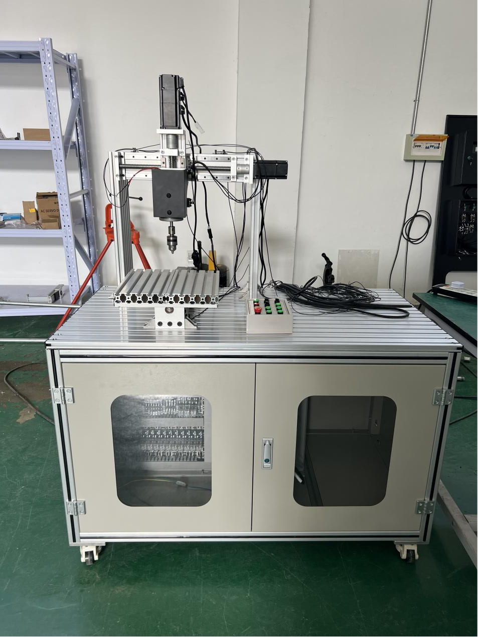 4、實(shí)訓(xùn)裝置雕刻機(jī)部分的實(shí)訓(xùn)桌面及其支撐腳、 電控柜主體框架全部采用優(yōu)質(zhì)標(biāo)準(zhǔn)鋁型材加工制作,機(jī)械強(qiáng)度好、重量輕、美觀大方,持久耐用。