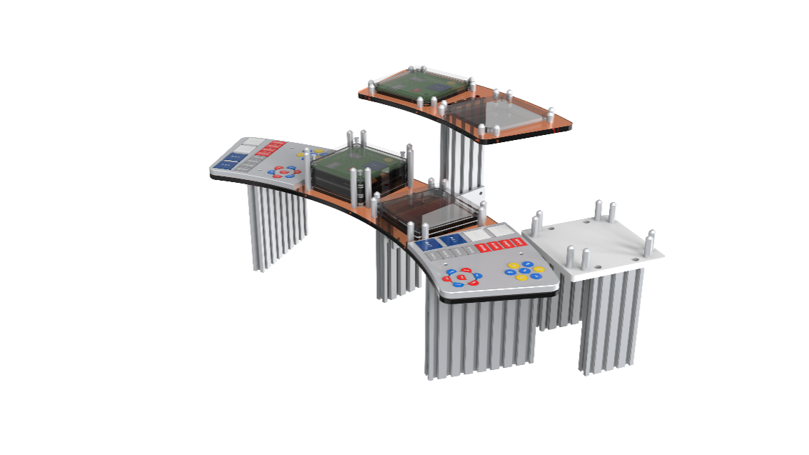 設(shè)備架體用于支持各單元,上臺(tái)面為型材臺(tái)面,各單元可方便在臺(tái)面安裝。具有腳輪,可用于移動(dòng)設(shè)備。上面安裝有云監(jiān)控安全光柵、三色燈,另一臺(tái)架控制面板上也具有三色燈,用于顯示協(xié)作機(jī)器人運(yùn)行狀態(tài)??刂泼姘灏惭b有急停開關(guān),可在緊急情況下快速停止設(shè)備。架體前方可開門,可放置工具、行星裝配模塊、2D軌跡訓(xùn)練單元、3D軌跡訓(xùn)練單元等物品。如圖所示。