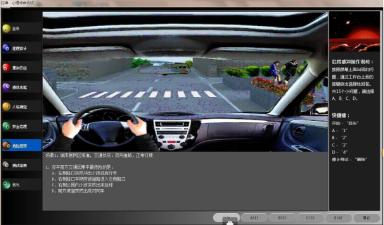 主要能實(shí)現(xiàn)速度估計(jì)測(cè)試、復(fù)雜反應(yīng)判斷測(cè)試、操作技能測(cè)試、危險(xiǎn)感知測(cè)試、駕駛員人格測(cè)試、駕駛員安全態(tài)度測(cè)試、注意力分配與轉(zhuǎn)移測(cè)試、深度知覺(jué)測(cè)試等內(nèi)容。