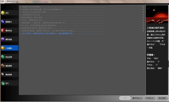 (1)本項(xiàng)測(cè)試的主要功能是測(cè)試與駕駛職業(yè)相關(guān)的4項(xiàng)基本人格特征,測(cè)驗(yàn)共60道題目,包含穩(wěn)定性、攻擊性、敢為性和獨(dú)立性4種人格特征,各人格因素相互之間的相關(guān)度極小,每一種因素的測(cè)量都能使被試者某一方面的人格特征有清晰而獨(dú)特的認(rèn)識(shí),更能對(duì)被試人格的4種不同因素的組合做出綜合性的了解,從而全面評(píng)價(jià)其整個(gè)人的駕駛品格。