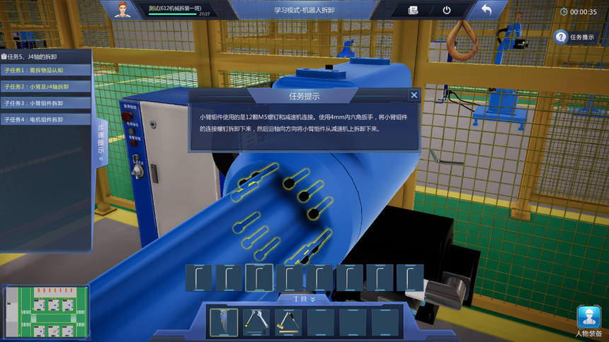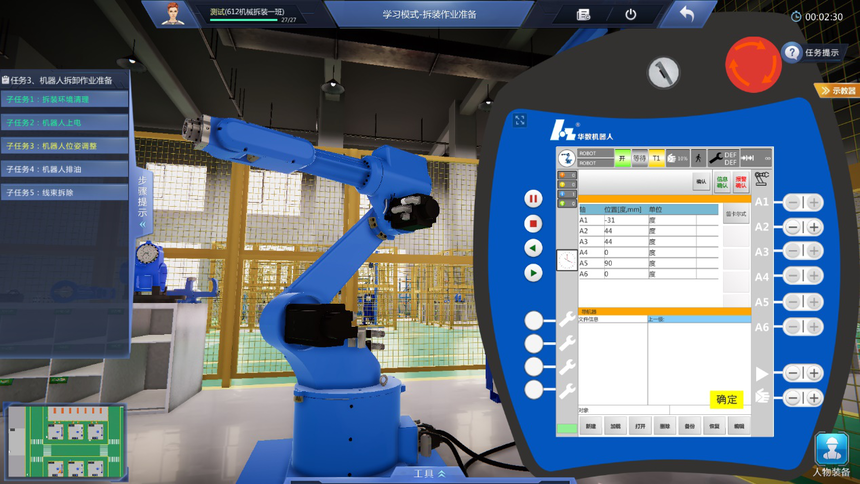 4、學(xué)習(xí)模式教學(xué)實訓(xùn)任務(wù)豐富:機器人拆裝作業(yè)準(zhǔn)備虛擬仿真實訓(xùn)項目包含拆裝作業(yè)防護準(zhǔn)備、機器人拆裝工具認知、機器人拆卸作業(yè)準(zhǔn)備等至少3個教學(xué)實訓(xùn)任務(wù);機器人本體拆卸虛擬仿真實訓(xùn)項目包含機器人整體拆卸、機器人J6軸到J1軸的分步拆卸、諧波減速機的認知、RV減速機的認知等至少9個教學(xué)實訓(xùn)任務(wù);機器人本體安裝虛擬仿真實訓(xùn)項目包含機器人整體安裝、機器人J1軸到J6軸的分步安裝、機器人注油、軸承的認知、軸的初步認知等至少少10個教學(xué)實訓(xùn)任務(wù)。機器人初步調(diào)試項目包含調(diào)試前準(zhǔn)備、機器人開機、機器人關(guān)機、機器人基礎(chǔ)調(diào)試、機器人精度檢測等至少5個教學(xué)實訓(xùn)任務(wù)。