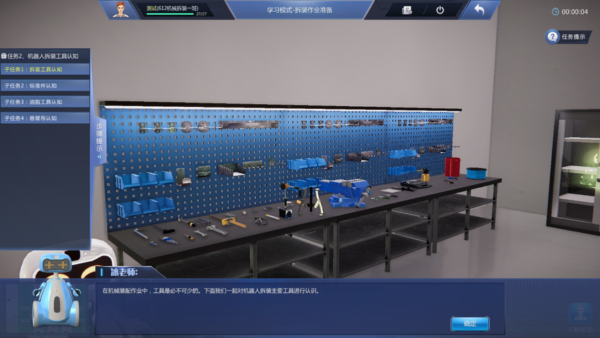 本系統(tǒng)的教學(xué)設(shè)計,采用項目式教學(xué)與游戲闖關(guān)式相結(jié)合,在項目學(xué)習(xí)、練習(xí)、測試三個環(huán)節(jié)中強化學(xué)習(xí)的知識與技能,提高學(xué)習(xí)的有效性。實訓(xùn)系統(tǒng)涵蓋了工業(yè)機器人本體拆卸與裝配的全流程,打開了工業(yè)機器人結(jié)構(gòu)及裝配調(diào)試的神秘面紗。