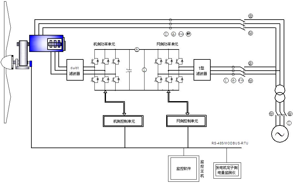 包括雙饋異步風(fēng)力發(fā)電機(jī)組、風(fēng)力機(jī)控制柜、雙饋?zhàn)兞髌鞴?、大功率三相自耦調(diào)壓器、監(jiān)控軟件六個(gè)部分。