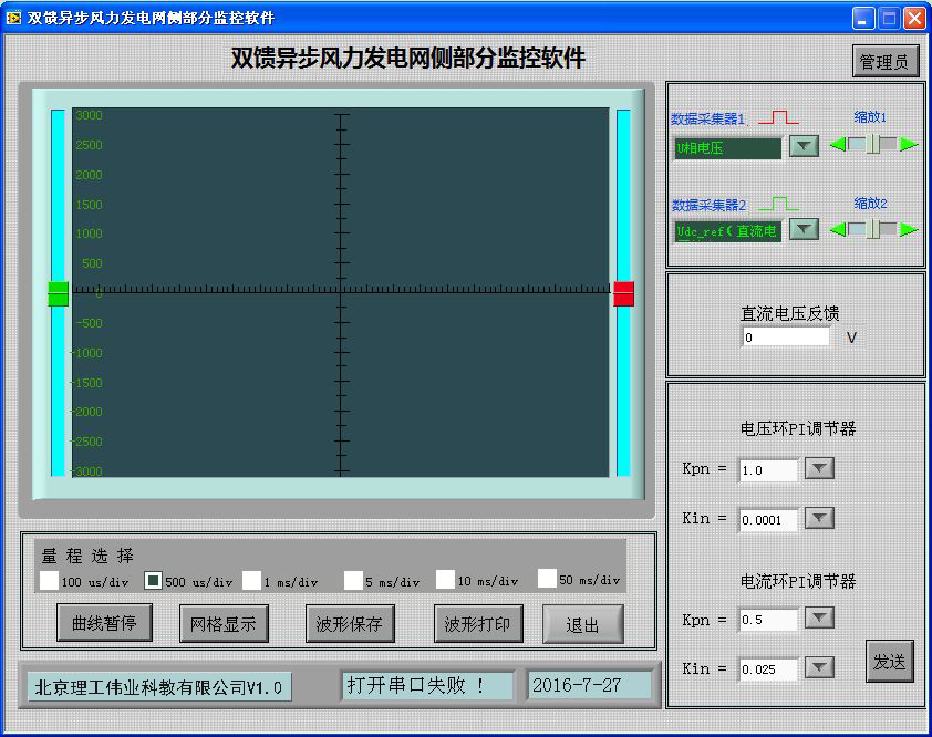 機(jī)側(cè)控制器的作用主要有兩個(gè)方面,一是給雙饋發(fā)電機(jī)的轉(zhuǎn)子提供勵(lì)磁分量的電流,從而可以調(diào)節(jié)雙饋發(fā)電機(jī)的定子側(cè)所發(fā)出的無功功率;二是通過控制雙饋發(fā)電機(jī)轉(zhuǎn)子轉(zhuǎn)矩分量的電流控制發(fā)電機(jī)的轉(zhuǎn)速或控制發(fā)電機(jī)定子側(cè)所發(fā)出的有功功率,從而使發(fā)電機(jī)運(yùn)行在風(fēng)力機(jī)的*佳功率曲線上,實(shí)現(xiàn)*大風(fēng)能追蹤(捕獲)運(yùn)行。機(jī)側(cè)控制器面板安裝有兩個(gè)信號指示燈,16鍵PVC軟鍵盤,240*128點(diǎn)蘭色液晶屏及9個(gè)波形測試端子。信號指示燈可對控制器工作、保護(hù)狀態(tài)分別指示;鍵盤可完成機(jī)側(cè)控制器啟動(dòng)/停止設(shè)置,*大功率啟動(dòng)/停止跟蹤設(shè)置,有功/無功給定,手動(dòng)并網(wǎng)/離網(wǎng);液晶屏可顯示轉(zhuǎn)速反饋值,有功/無功反饋值;波形測試端子可通過示波器觀測發(fā)電機(jī)機(jī)轉(zhuǎn)子、定子相電流波形,可觀測發(fā)電機(jī)定子相電壓、電網(wǎng)相電壓波形。