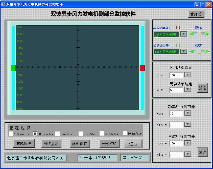 機(jī)側(cè)控制器的作用主要有兩個(gè)方面,一是給雙饋發(fā)電機(jī)的轉(zhuǎn)子提供勵(lì)磁分量的電流,從而可以調(diào)節(jié)雙饋發(fā)電機(jī)的定子側(cè)所發(fā)出的無(wú)功功率;二是通過(guò)控制雙饋發(fā)電機(jī)轉(zhuǎn)子轉(zhuǎn)矩分量的電流控制發(fā)電機(jī)的轉(zhuǎn)速或控制發(fā)電機(jī)定子側(cè)所發(fā)出的有功功率,從而使發(fā)電機(jī)運(yùn)行在風(fēng)力機(jī)的*佳功率曲線上,實(shí)現(xiàn)*大風(fēng)能追蹤(捕獲)運(yùn)行。機(jī)側(cè)控制器面板安裝有兩個(gè)信號(hào)指示燈,16鍵PVC軟鍵盤,240*128點(diǎn)蘭色液晶屏及9個(gè)波形測(cè)試端子。信號(hào)指示燈可對(duì)控制器工作、保護(hù)狀態(tài)分別指示;鍵盤可完成機(jī)側(cè)控制器啟動(dòng)/停止設(shè)置,*大功率啟動(dòng)/停止跟蹤設(shè)置,有功/無(wú)功給定,手動(dòng)并網(wǎng)/離網(wǎng);液晶屏可顯示轉(zhuǎn)速反饋值,有功/無(wú)功反饋值;波形測(cè)試端子可通過(guò)示波器觀測(cè)發(fā)電機(jī)機(jī)轉(zhuǎn)子、定子相電流波形,可觀測(cè)發(fā)電機(jī)定子相電壓、電網(wǎng)相電壓波形。