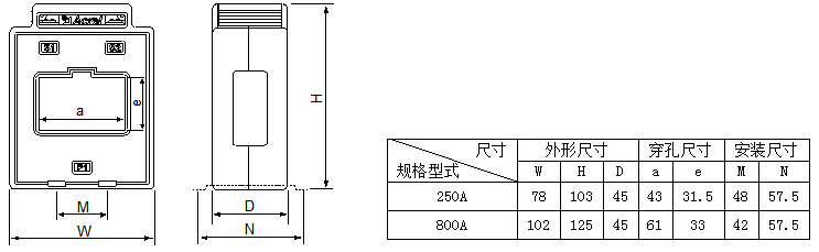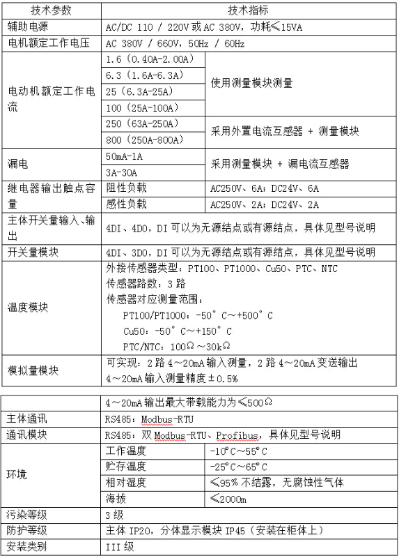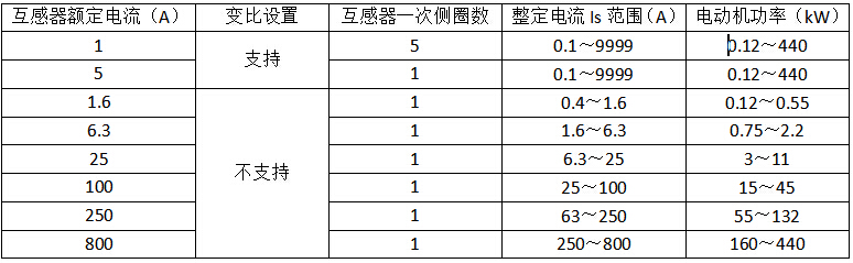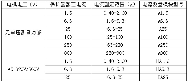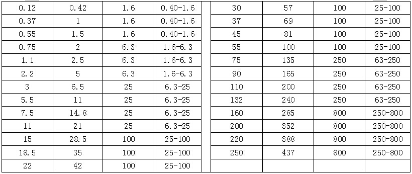 注:>250kW的低壓電動(dòng)機(jī),額定電流小于800A時(shí)均可選用800A等級的電動(dòng)機(jī)保護(hù)器。