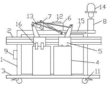 圖中1架體、2門導(dǎo)軌、3地坎、4轎門、5門掛板組件、6門機(jī)減速裝置、7連桿機(jī)構(gòu)、8手動(dòng)控制機(jī)構(gòu)、9電源、10配重塊、11萬向輪、12門機(jī)控制器、13電機(jī)、14照明燈、15到位