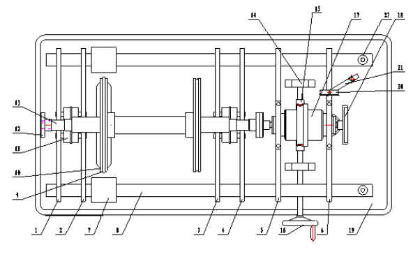 1、電機(jī),2、電機(jī)基座,3、實(shí)驗(yàn)臺(tái)平臺(tái),4、測(cè)速盤,5、彈性聯(lián)軸器,6、測(cè)速傳感器,7、轉(zhuǎn)子軸,8、平衡盤,9、差速器,10、表?xiàng)U,11、百分表,12、補(bǔ)嘗盤,13、彈簧,14、蝸桿。