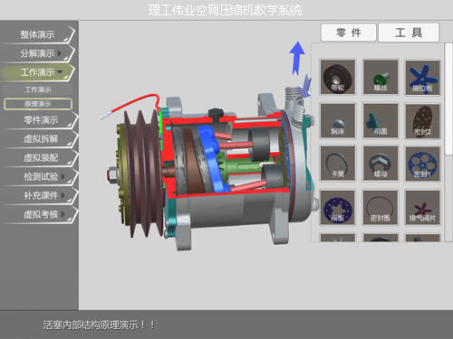 空調(diào)壓縮機(jī)虛擬仿真教學(xué)系統(tǒng) 選用空調(diào)壓縮機(jī)的實(shí)物進(jìn)行1:1的建模,從各大院校對(duì)汽車(chē)空調(diào)壓縮機(jī)的教學(xué)要求出發(fā),采用三維仿真教學(xué)風(fēng)格,空調(diào)壓縮機(jī)可以在虛擬仿真...