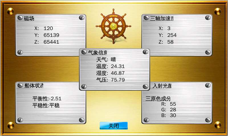 該系統(tǒng)表征了傳感器在航海導航領域的應用,界面顯示海上航行船舶的狀態(tài)信息及所處周圍環(huán)境、氣象信息等。