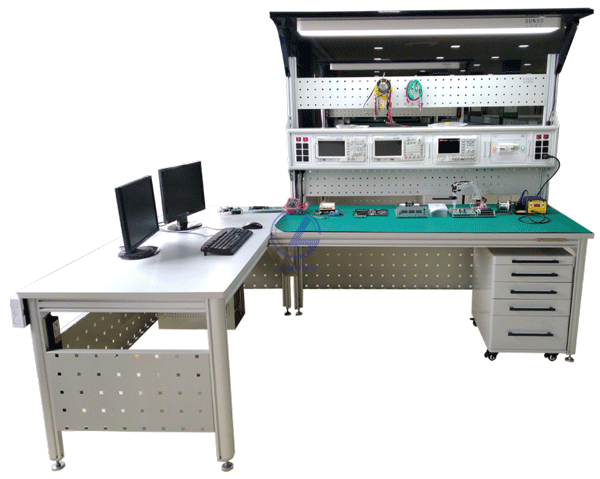 1.工作臺:桌身采用優(yōu)質(zhì)鋁型材做骨架,整機(jī)既堅(jiān)固耐用,美觀大方。桌面采用25mm厚高密度纖維板,外貼防火板,PVC截面封邊,具有耐磨、耐熱、耐污、耐火、耐菌、防霉、抗靜電及易清潔等特點(diǎn)。工作臺設(shè)有防靜電配套裝置,桌面上方有實(shí)訓(xùn)屏、模塊盒安放橫梁、工具網(wǎng)孔板、高檔條形LED照明。