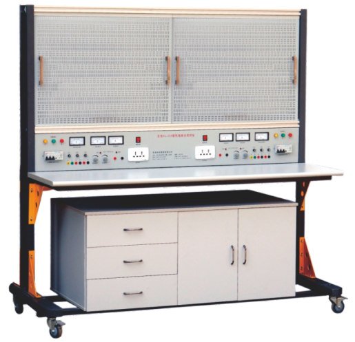 5、本設(shè)備由實訓(xùn)屏(內(nèi)置電源)、實訓(xùn)桌、儲物柜三大部分組成。以30mm×30mm成型方鋼作為設(shè)備主要框架材料;實訓(xùn)屏、地盤采用焊接連接、關(guān)鍵部位采用三角筋用內(nèi)六角螺釘加固連接,表面經(jīng)高溫噴塑處理,美觀大方且有效起到防銹絕緣的作用;由兩條35mm×35mm鋁合金型材及滑槽組成網(wǎng)孔板固定機構(gòu);固定機構(gòu)的下方是鐵制雙工位電源箱,每工位電源箱的布局依次為電源保護裝置、電源指示裝置、電源輸出;實訓(xùn)桌桌面采用25mm麻灰色高密度層壓板封邊特制,有效提高絕緣等級;實驗桌底部裝有至少4個導(dǎo)向輪,方便設(shè)備移動;