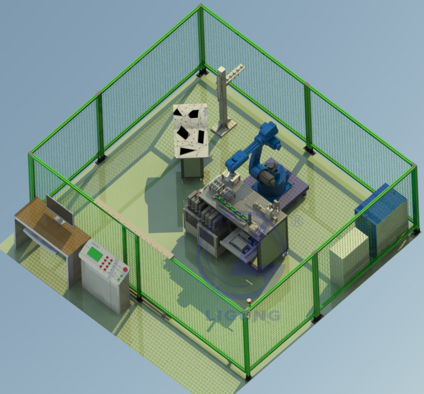 LGH-JR12型 工業(yè)機(jī)器人綜合教學(xué)實(shí)訓(xùn)平臺(tái)整體占地尺寸為 4000mm*4000mm*1500mm(詳見(jiàn)下圖)。工作站含 LG-ZN612型工業(yè)機(jī)器人及其控制柜 1 套、基礎(chǔ)實(shí)訓(xùn)臺(tái) 1 套、綜合實(shí)訓(xùn)臺(tái) 1 套、IO 及 PLC 操作臺(tái) 1 套、安全防護(hù)設(shè)施 1 套、電腦及電腦桌椅(選配)等。