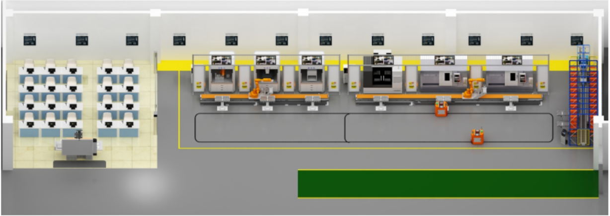 數(shù)字化協(xié)同制造與設(shè)計(jì)中心、數(shù)控機(jī)床加工制造單元及其自動(dòng)化改造、自動(dòng)化清洗單元、,自動(dòng)化檢測(cè)單元、自動(dòng)化裝配單元、自動(dòng)化立體倉儲(chǔ)單元、多軸移動(dòng)工業(yè)機(jī)器人上下料單元、AGV運(yùn)載單元、監(jiān)控單元、系統(tǒng)中央控制單元