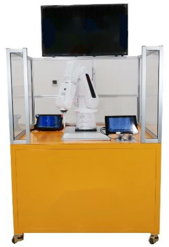 該設(shè)備采用一體化的形式,外觀簡(jiǎn)潔大氣,結(jié)構(gòu)牢固。設(shè)備下半部分使用鈑金桌體,噴漆顏色為工業(yè)黃,上半部分在鋁型材框架中裝有有機(jī)玻璃,確保設(shè)備周圍人員的安全,在框架上配備有一臺(tái)顯示器,可在屏幕上展示設(shè)備圖片或者運(yùn)行視屏等內(nèi)容。在該設(shè)備上搭載有HRT-120寫(xiě)字繪畫(huà)模塊和恒銳HRP-M多系統(tǒng)編程移動(dòng)平臺(tái),機(jī)器人可將該平板繪畫(huà)板上書(shū)畫(huà)的字和圖案按原畫(huà)在畫(huà)布上重現(xiàn)。