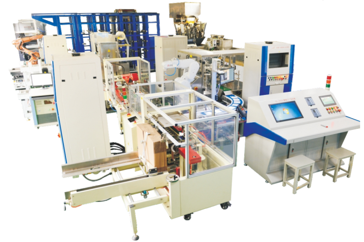 LGY-ZN012A型智能工廠實(shí)訓(xùn)室由控制系統(tǒng)(PLC)、制造執(zhí)行系統(tǒng)(MES)、資源管理系統(tǒng)(ERP) 三層結(jié)構(gòu)組成,主要由PLC控制、顆粒包裝、液體包裝、工業(yè)機(jī)器人裝配、紙箱成型機(jī)、封箱機(jī)、激光打碼、貼標(biāo)、掃碼器、工業(yè)機(jī)器人倉儲(chǔ)搬運(yùn)、巷道式倉儲(chǔ)、吹膜單元、印刷單元、制袋單元、行走工業(yè)機(jī)器人搬運(yùn)、AGV、RFID、掃碼定位、激光測距、氣動(dòng)元件等組成。