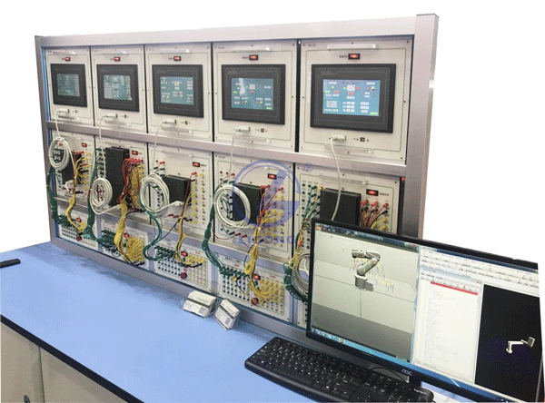 (4)配置與真實(shí)產(chǎn)線一致的PLC、人機(jī)界面,各6個(gè)站;西門子1200系列PLC6臺;昆侖通態(tài)TCP7032KT觸摸屏6臺;機(jī)器人示教器1套所有端口引出至面板的安全插座上,方便實(shí)驗(yàn)連線。每個(gè)模塊安裝在掛箱上。