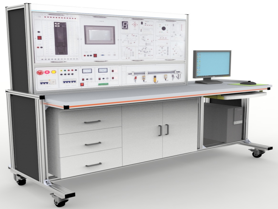 2、臺架構(gòu)成:實(shí)訓(xùn)臺采用工業(yè)鋁型材加工。桌面下面放置儲物柜,左側(cè)有3層抽屜,用于存放工具以及實(shí)訓(xùn)資料,右側(cè)為雙拉門式設(shè)計,可以放置實(shí)訓(xùn)掛箱。底部裝有四個帶鎖止功能的萬向輪。柜體后下側(cè)留有電源輸入線。預(yù)留計算機(jī)放置位置。
