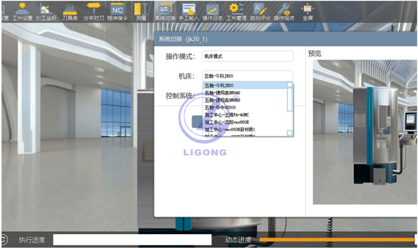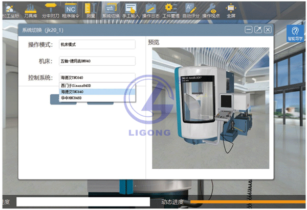 LGS-SX02型 數(shù)控車銑加工一體化創(chuàng)新仿真實(shí)訓(xùn)平臺的數(shù)字孿生機(jī)床仿真部分,操作極為簡單,放大、縮小、旋轉(zhuǎn)、平移、觸控等等。學(xué)生無需特殊訓(xùn)練,即可直接上手使用??芍С职ㄈS的數(shù)控機(jī)床如法蘭克、西門子、華中、廣數(shù),以及多軸的數(shù)控機(jī)床如西門子840D、華中848D、海德漢TNC640等主流操作系統(tǒng),支持加工中心、車床、斜床等數(shù)控機(jī)床設(shè)備,目前數(shù)控I8多軸智能訓(xùn)練機(jī)包含了11套不同類型數(shù)控系統(tǒng)設(shè)備。