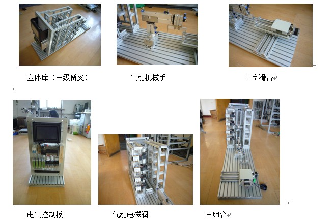 LGZH-02 柔性三組合機電一體化創(chuàng)新模型由小型立體倉庫創(chuàng)新模型、氣動機械手創(chuàng)新模型、二維十字滑臺創(chuàng)新模型、電氣系統網孔安裝板四部分組合構成。四部分模型安裝在鋁合金框架底板上,總體積為1500×360×500高(mm)