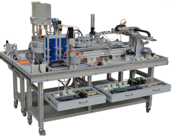 系統(tǒng)由鍵盤抽屜、電腦桌、主桌體、觸摸屏模塊、、掛箱抽屜、包裝蓋章單元、桌面接口線路板、立體倉庫單元、執(zhí)行機(jī)構(gòu)線路板、氣源三聯(lián)件、轉(zhuǎn)盤上料單元、加熱與檢測(cè)單元、1#輸送帶模塊、灌裝加蓋單元、2#輸送帶模塊、3#輸送帶單元、機(jī)器人搬運(yùn)單元等組成。