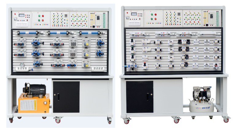 該實訓(xùn)裝備覆蓋了氣壓傳動、液壓傳動、傳動繼電器控制、PLC自動控制、傳感器應(yīng)用技術(shù)等多個技術(shù)領(lǐng)域 。是氣壓傳動技術(shù)、液壓傳動技術(shù)和各種現(xiàn)代控制技術(shù)的組合體。加上該實訓(xùn)采用雙面工作臺結(jié)構(gòu)設(shè)計,一個實訓(xùn)裝備可供兩組學(xué)生同時進行各自不同的實訓(xùn),大大的提高了實訓(xùn)設(shè)備的使用效率,并有效的利用了實訓(xùn)室空間。