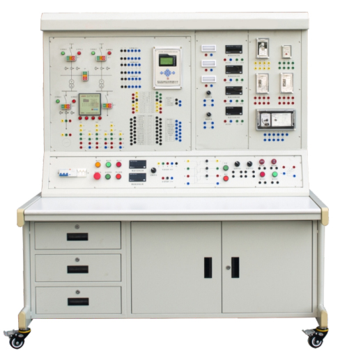 本裝置由實(shí)驗(yàn)臺(tái),實(shí)驗(yàn)桌、實(shí)驗(yàn)?zāi)K、大功率三相自耦調(diào)壓器四部份組成。本裝置的實(shí)驗(yàn)臺(tái)左側(cè)有10kV/0.4KV一次系統(tǒng)主接線面板,實(shí)驗(yàn)臺(tái)右側(cè)為實(shí)驗(yàn)?zāi)K掛放區(qū)、實(shí)驗(yàn)臺(tái)下側(cè)為電源實(shí)驗(yàn)臺(tái)。