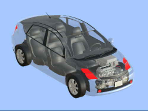 普銳斯混合動(dòng)力仿真軟件可在3D環(huán)境下展示混合動(dòng)力系統(tǒng)主要零部件的安裝位置及對(duì)應(yīng)關(guān)系,車殼采用透明模式,可通過鼠標(biāo)進(jìn)行360度自由旋轉(zhuǎn);
