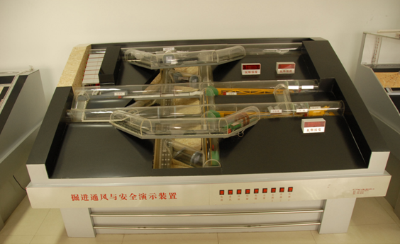 該掘進(jìn)與通風(fēng)工作面生產(chǎn)安全演示裝置(適合于二、三、四級(jí)),直觀反映出綜掘工作面與炮掘工作面巷道布置,三專(zhuān)二閉鎖等生產(chǎn)工藝,通風(fēng)系統(tǒng),綜合防塵系統(tǒng),隔爆設(shè)施,瓦斯監(jiān)測(cè)系統(tǒng),運(yùn)輸系統(tǒng)的布置方式,相互位置及利用聲、光技術(shù)顯示的工藝流程等。