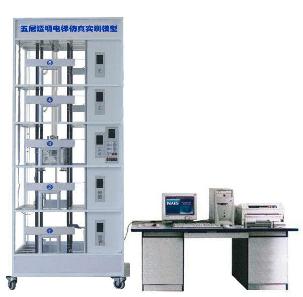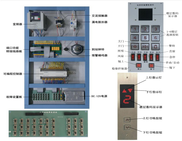電梯:整體為不銹鋼框架,內(nèi)含井道、轎箱、廳門、轎門、內(nèi)呼按鈕 1 套、外呼按鈕5 套、樓層顯示、電氣系統(tǒng)等組成,具有真實電梯的基本結(jié)構(gòu)組成。