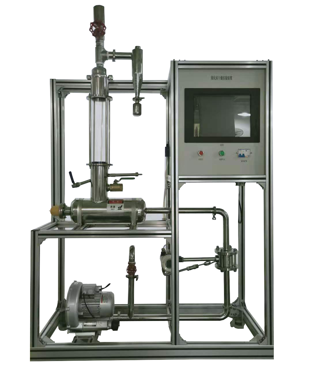 1、流化床干燥器:Φ110×400mm,除床身筒體一部分采用高溫硬質(zhì)玻璃外,其余均采用304不銹鋼制造,進口處有不銹鋼氣流均布器。