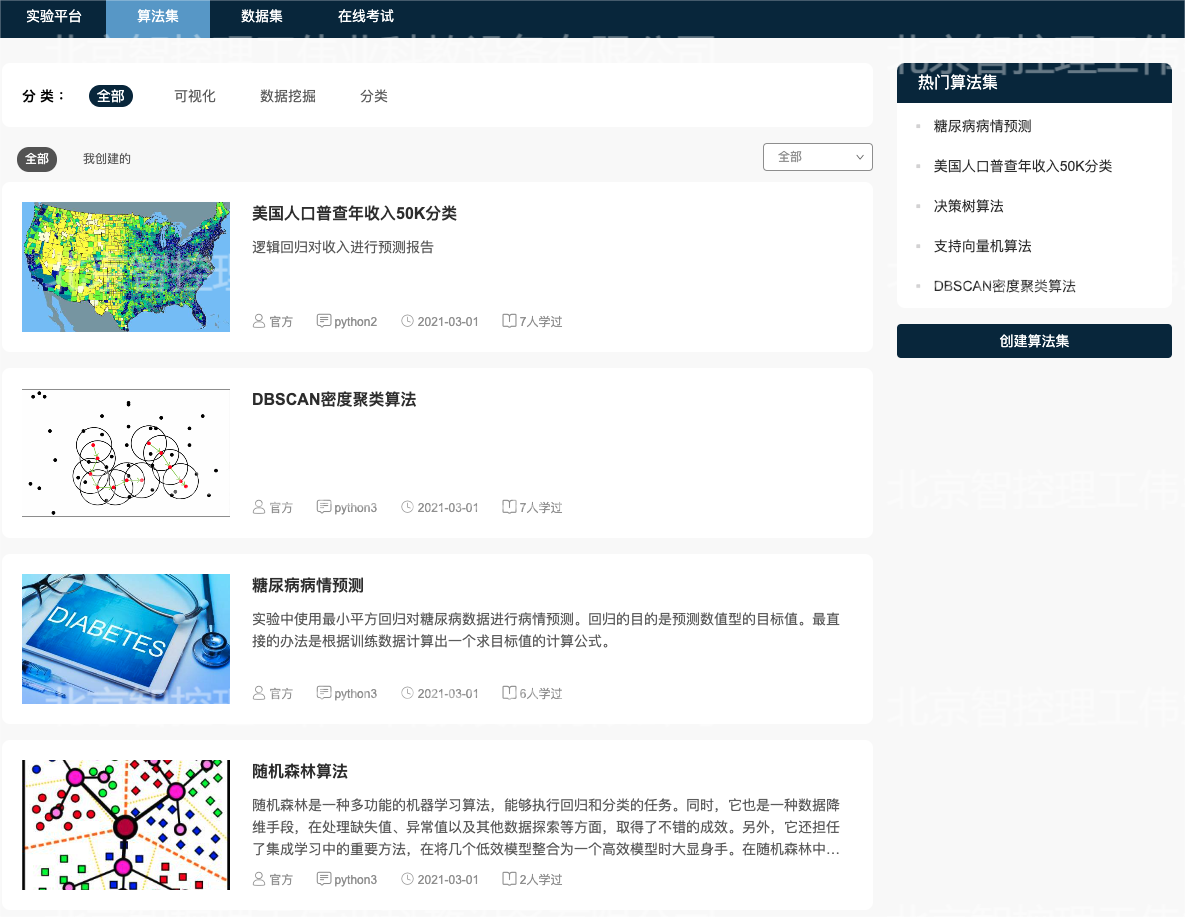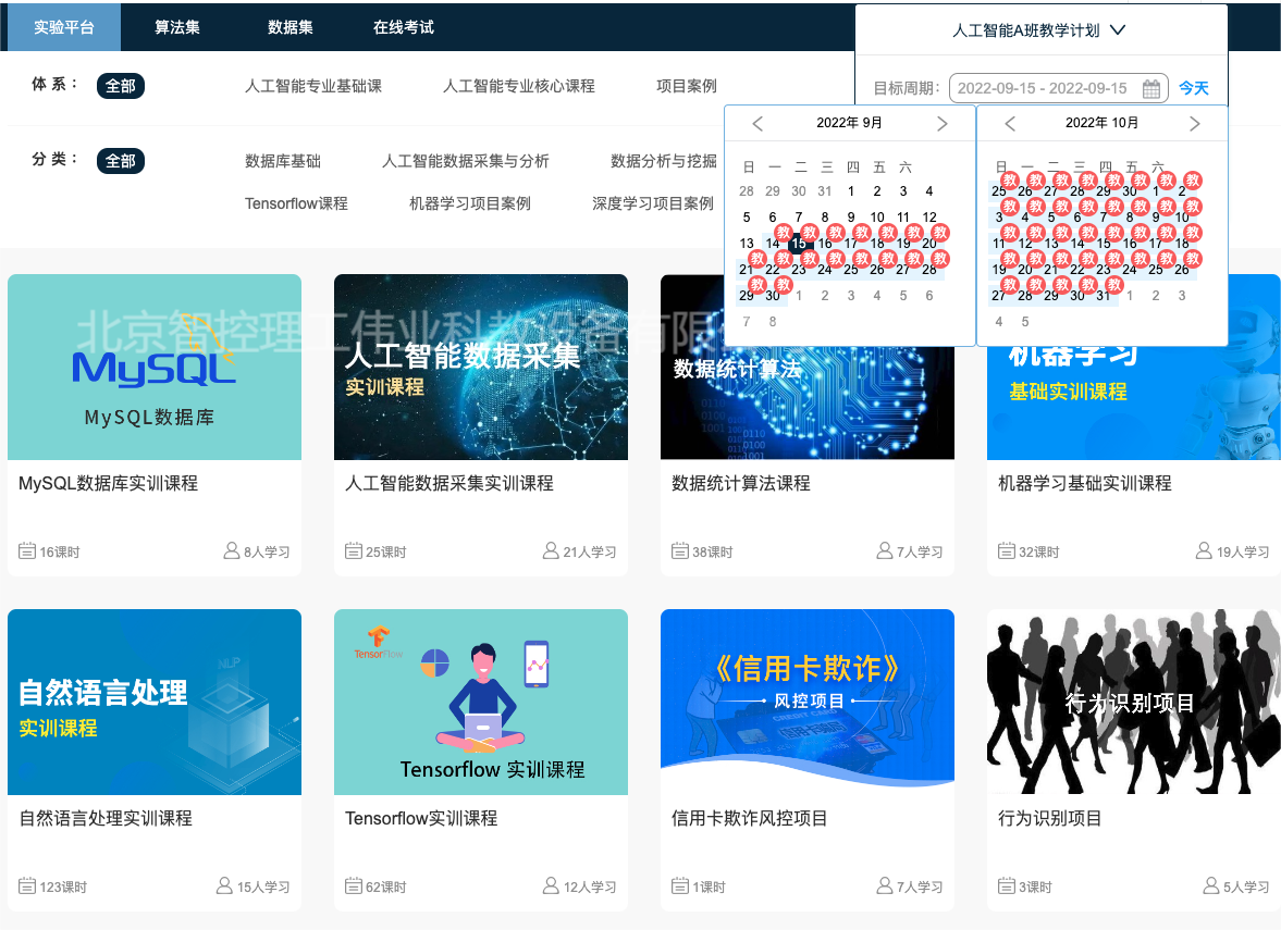 人工智能實(shí)訓(xùn)課程資源共計(jì)200多個(gè),資源涵蓋了操作系統(tǒng)類(lèi)、數(shù)據(jù)庫(kù)類(lèi)、編程語(yǔ)言類(lèi)、統(tǒng)計(jì)分析類(lèi)、機(jī)器學(xué)習(xí)類(lèi)、神經(jīng)網(wǎng)絡(luò)與深度學(xué)習(xí)類(lèi)、自然語(yǔ)言處理類(lèi)、機(jī)器視覺(jué)類(lèi)、智能硬件類(lèi)課程等諸多方面課程,課程類(lèi)型包括基礎(chǔ)實(shí)訓(xùn)、關(guān)鍵技術(shù)掌握、應(yīng)用創(chuàng)新等,是一個(gè)綜合性的學(xué)習(xí)研究平臺(tái);平臺(tái)配合專(zhuān)用的資源監(jiān)控系統(tǒng)、課程監(jiān)控系統(tǒng),可實(shí)時(shí)的監(jiān)控整個(gè)平臺(tái)的硬件資源負(fù)載以及學(xué)生學(xué)習(xí)的狀態(tài),可幫助教師合理的安排課程及對(duì)應(yīng)資源。