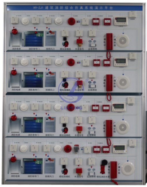 定制展示架由工業(yè)鋁型材制作、感煙探測(cè)器、感溫探測(cè)器、聲光警報(bào)器、火災(zāi)顯示盤、模擬消防電梯迫降模塊、應(yīng)急照明及疏散指示標(biāo)志、防排煙系統(tǒng)組件、消防應(yīng)急廣播模塊及揚(yáng)聲器、消防電源強(qiáng)切、繼電器、按鈕、蜂鳴器等。實(shí)現(xiàn)火災(zāi)自動(dòng)報(bào)警、聯(lián)動(dòng)控制建筑物防排煙系統(tǒng)、消防噴淋泵、消防栓系統(tǒng)泵、電梯迫降、應(yīng)急照明疏散指示、電切、防煙樓梯間模擬演示功能,立體化實(shí)操教學(xué)設(shè)備。配置萬(wàn)向輪、航空插頭插座、工業(yè)插頭插座,可與其他設(shè)備快速組合安裝。