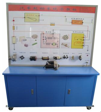 示教板上半部分為起動機的分解零部件,下半部分為實物總成;蓄電池、點火開關、電源總開關、彩色原理與結構圖、故障設置系統(tǒng)、使用說明書等。