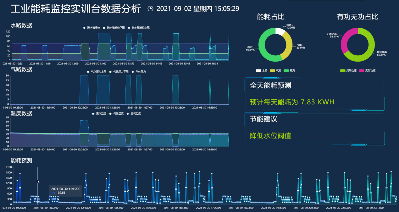 LGHL-04型 工業(yè)互聯(lián)能耗監(jiān)控實訓臺以水、氣、電能耗監(jiān)測為背景,采用液位計、流量計、溫度變送器、壓力變送器、電磁閥、水泵、氣泵、電氣控制箱、水箱等裝置模擬工業(yè)場景下的水循環(huán)、氣循環(huán)、電能監(jiān)測常見的過程控制系統(tǒng)。其中水箱作為液體盛放和氣體導入的氣液混合容器,模擬化工行業(yè)常見的化工產(chǎn)品制備工藝場景。通過現(xiàn)場監(jiān)控裝置及傳輸模塊,將液位、流量、壓力、水溫、氣溫、電壓、電流、電量等過程控制參數(shù)進行數(shù)據(jù)采集,傳輸?shù)侥茉垂芾砥脚_,達到工業(yè)水、電、氣等至少三種數(shù)據(jù)采集控制、數(shù)據(jù)傳輸、數(shù)據(jù)存儲、數(shù)據(jù)分析及可視化展示的目的。