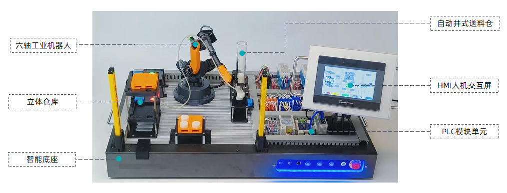 該實(shí)訓(xùn)臺尺寸接近課桌尺寸,僅1000mm × 600mm。使用桌面級工業(yè)機(jī)器人為執(zhí)行單元,保證操作安全性。