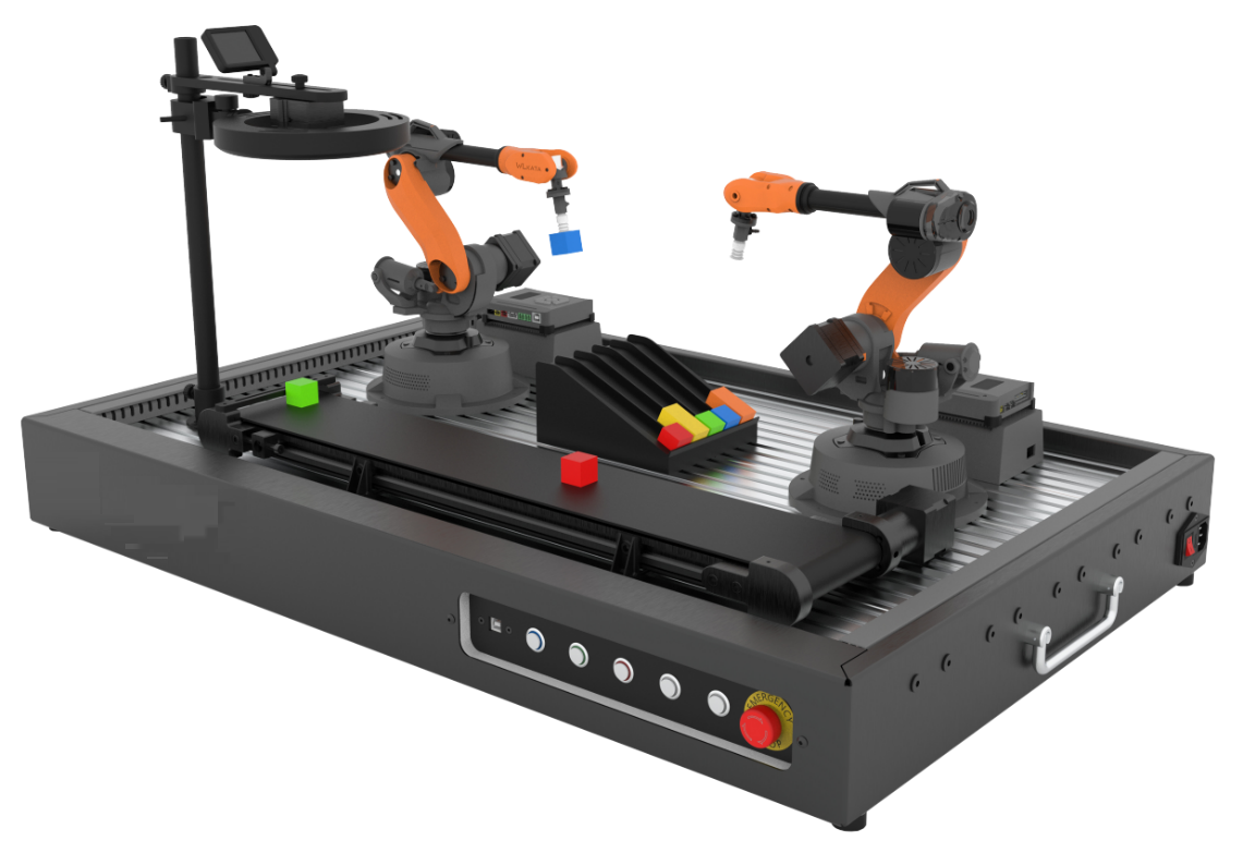 1、功能描述:產(chǎn)線由機(jī)械臂、傳送帶套件及AI視覺套件組成,沙盤模擬視覺系統(tǒng)與機(jī)械臂在工業(yè)自動化中的配合協(xié)作。本產(chǎn)線可自動化循環(huán)運行,運行時木塊滑臺上的傳感器判斷當(dāng)前位置是否有木塊,并控制機(jī)械臂隨機(jī)吸取一個顏色的木塊放置于傳送帶上,傳送帶將木塊運送至視覺模塊下方,視覺模塊分析木塊的顏色及位置信息并控制左側(cè)的機(jī)械臂將木塊放置于滑臺的對應(yīng)位置,此過程循環(huán)往復(fù);