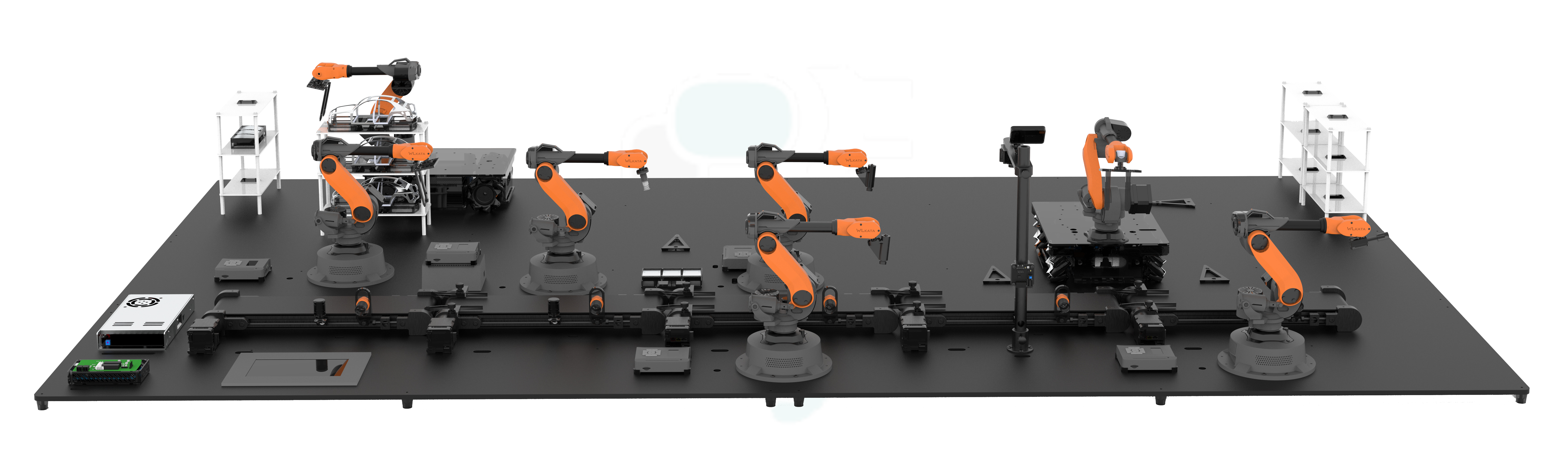 桌面六軸機(jī)器人*5;復(fù)合移動(dòng)機(jī)器人*2;AI視覺套件*1;傳送單元*5;人機(jī)交互屏*1;配件包*1