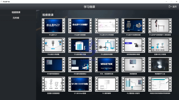 (3)微課學(xué)習(xí)包括視頻學(xué)習(xí)和元件庫兩個部分,視頻學(xué)習(xí)包括PLC相關(guān)的學(xué)習(xí)視頻20個,元件庫包括PLC相關(guān)的電氣元件的三維模型。三維模型總數(shù)不少于20個。