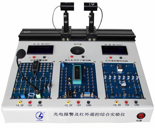 我司自主研發(fā)的LG-CDJ01型光電報警及紅外遙控實驗儀具有兩大功能,一是光電報警系統(tǒng),通過感光器件(紅外接收管)把光信號轉(zhuǎn)換成電信號,控制數(shù)碼管的顯示以及報警電路,利用部分數(shù)字邏輯電路及單片機,實現(xiàn)在報警過程中顯示對應(yīng)路數(shù)的功能。二是紅外遙控系統(tǒng)(遠程控制技術(shù)又稱為遙控技術(shù),是指實現(xiàn)對被控目標(biāo)的遙遠控制,在工業(yè)控制、航空航天、家電領(lǐng)域應(yīng)用廣泛。紅外遙控是一種無線、非接觸控制技術(shù),具有抗干擾能力強,信息傳輸可靠,功耗低,成本低,易實現(xiàn)等顯著優(yōu)點,被諸多電子設(shè)備特別是家用電器廣泛采用,并越來越多的應(yīng)用到計算機中),該系統(tǒng)通過對紅外遙控器的解碼實現(xiàn)各種控制電路,如數(shù)碼管顯示控制、發(fā)光二極管發(fā)光控制、蜂鳴器開關(guān)控制等。本款儀器的設(shè)計采用可搭建電路組件的結(jié)構(gòu),從設(shè)計、安裝、搭建、調(diào)試等方面入手,全面提高學(xué)生的動手動腦能力和技術(shù)水平。