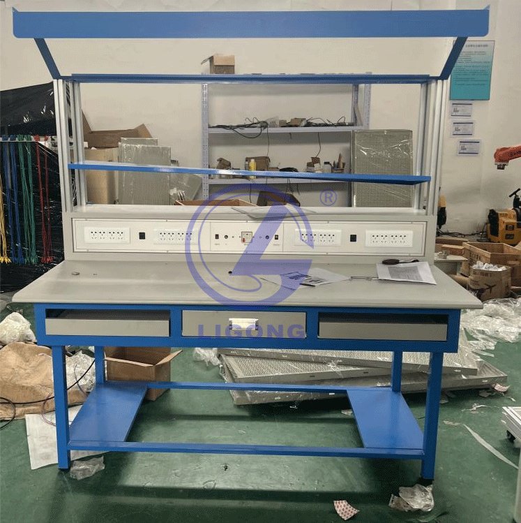 1、實訓臺:采用工業(yè)鋁合金型材框架,共兩層,其中第一層可放置維修工具、套件、儀器儀表;第二層可放顯示器,頂部設(shè)有30W日光燈一盞和風扇一臺。實訓臺設(shè)有一個抽屜、兩個鍵盤托架、兩個主機柜,下方有四個剎車的萬向輪。