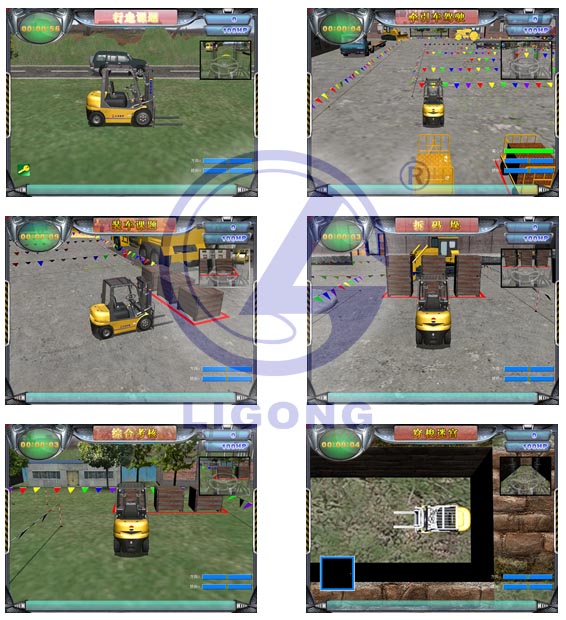 ★裝載機模擬機課題數(shù)目共5個:行走、移庫、裝車、平整、打堆。叉車模擬機課題數(shù)目共6個:行走、牽引車、拆垛碼、裝車、綜合考核、娛樂教學。